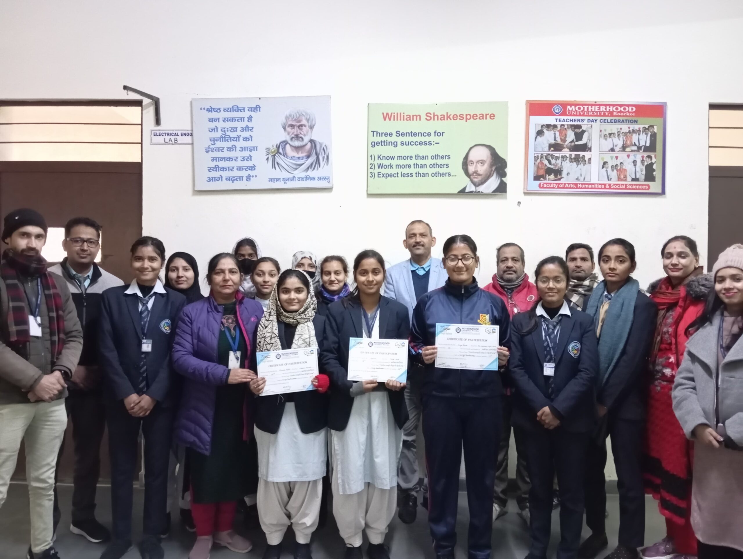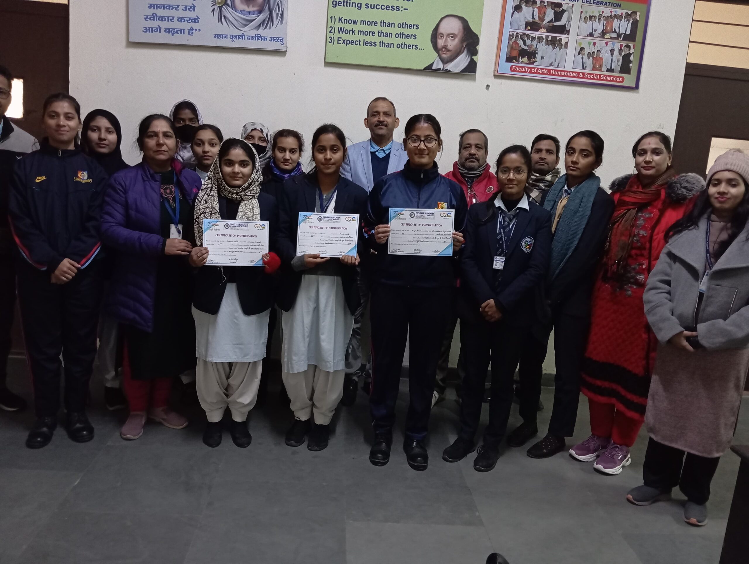 मानविकी कला एवं सामाजिक संकाय में हिंदी विभाग द्वारा विश्व हिंदी दिवस के उपलक्ष में आलेखन प्रतियोगिता संपन्न कराई गई| प्रतियोगिता में रीया राणा प्रथम, बुसरा मलिक द्वितीय .और आयशा ने तृतीय स्थान प्राप्त किया | इस अवसर पर शैक्षिक अधिष्ठाता प्रो. डॉक्टर वी. के. सिंह एवं संकाय अधिष्ठाता डॉक्टर अलका साहित समस्त प्रोफेसर(डॉक्टर अमित उपाध्याय, श्री दुनेश नेगी, डॉक्टर राजीव कुमार, साक्षी बिल्टोरिया) उपस्थित रहे। वी के सिंह जी ने हिंदी भाषा के विकास हेतु छात्र -छात्राओ का उत्साहवर्धन किया |इस संदर्भ में प्रोफेसर (डॉ.) वी.के.सिंह ने व्यक्तिगत और व्यावसायिक जीवन में हिंदी के महत्व पर प्रकाश डाला। डीन, प्रोफेसर (डॉ.) अलका रानी ने भाषा और साहित्य सीखने पर जोर दिया। पूरे कार्यक्रम की मेजबानी आयोजन सचिव सहायक प्रोफेसर (हिंदी) डॉ. सुमन टांक, और संयोजक प्रो. (डॉ.) अंग्रेजी के प्रो कमल भट्टाचार्य की देखरेख में की गई।