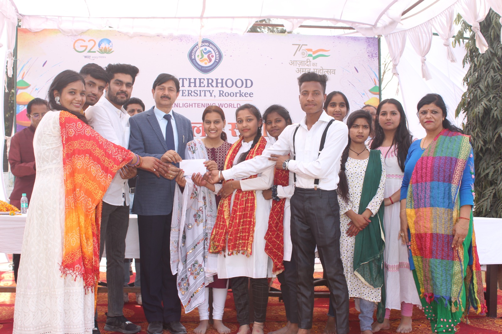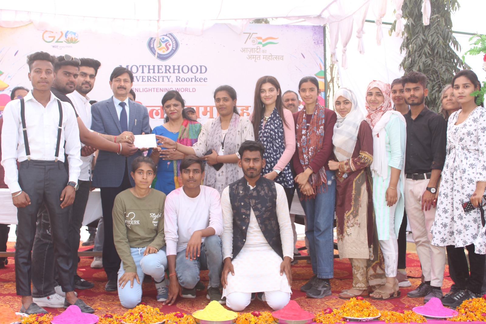 फाल्गुन मास होली के पावन पर्व पर सोमवार (06 मार्च 2023) को मदरहुड़ विश्वविद्यालय रुड़की (हरिद्वार) में होली मिलन समारोह का आयोजन किया गया। कार्यक्रम का शुभारम्भ – विश्वविद्यालय के कुलपति प्रो० (डॉ०) नरेन्द्र शर्मा, प्रशासनिक निदेशक श्री दीपक शर्मा, कुलसचिव डॉ० एन० के० यादव तथा शैक्षणिक निदेशक प्रो० (डॉ०) बी०के० सिंह द्वारा दीप प्रज्जवलित कर किया गया। तदोपरान्त विश्वविद्यालय में अध्ययनरत विद्यार्थियों द्वारा उत्कृष्ट प्रस्तुतियाँ प्रस्तुत की गयी। इस अवसर पर माननीय कुलपति महोदय ने होली पर्व की बधाई देते हुए कहा कि – होली का पर्व हमारी सांस्कृतिक धरोहर है यह हिन्दुओ का प्रमुख त्योहार है होली सौहार्द का संदेश देती है। इस तरह के कार्यक्रमों से हमें अपनी संस्कृति और पर्वो को अच्छी तरह से जानने और सबके साथ मिल-जुल कर पर्व मनाने का अवसर मिलता है।